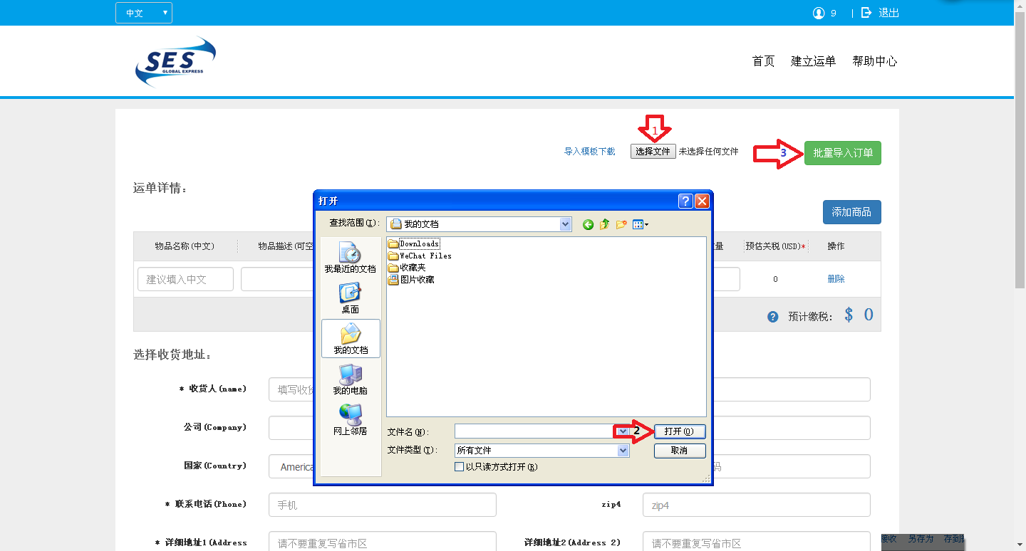 6.填写完成之后,保存好,然后在在线发件系统里点击1选择文件,2选择已经填好的导入模板打开,3批量导入订单。